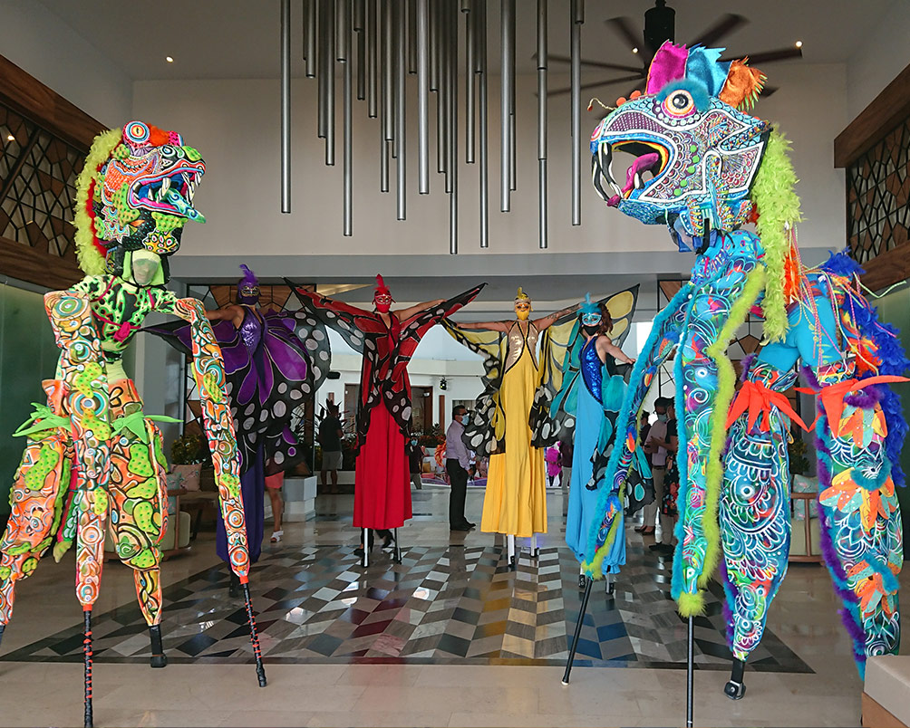 Los personajes en zancos son un elemento que luce en cualquier tipo de evento, tanto para ambientación como para recepción. Hermosas mariposas, hadas y unicornios con alas de Leds, malabaristas con clavas de luz, fuego o hulas, bellísimas catrinas y fabulosos Alebrijes de 4 patas, son sólo algunos de los que componen nuestra amplia variedad de personajes.