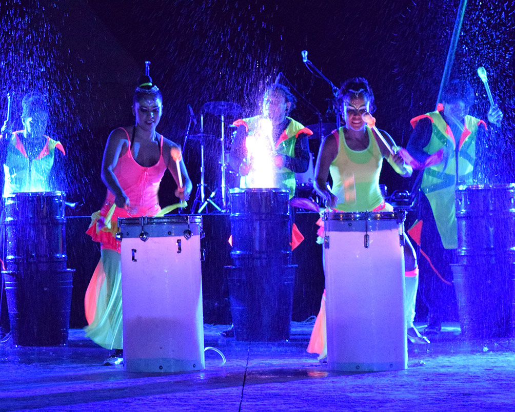 Al son de diferentes ritmos, el agua y la luz danzan sobre los tambores dando un magnífico espectáculo visual de la mano de bellas percusionistas con alas de LEDs. Ideal para diferentes tipos de evento en espacios exteriores, ofrece una experiencia interactiva que eleva la energía de sus invitados.